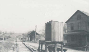 Minefield flag station facing railroad north, with covered milk platform in foreground, and the grade crossing at Grier Nursery Road and a store (at far right) also appear in this photograph. Photo source: M&PRR files - Insurance Survey Photo - Winter 1939 - 1940. Fischer, Rudy, Notes on M&PRR Flagstop Shelters; TIMETABLE, Vol 21, Number 1, Winter 2005; The Maryland and Pennsylvania Railroad Historical Society, Inc. © Copyright The Maryland and Pennsylvania Railroad Historical Society, 2005.